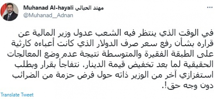 وقال في تغريدة عبر "تويتر" رصدها "المشهد العربي": "في الوقت الذي ينتظر فيه الشعب عدول وزير المالية عن قراره بشأن رفع سعر صرف الدولار الذي كانت أعباءه كارثية على الطبقة الفقيرة والمتوسطة نتيجة عدم وضع المعالجات الحقيقية لما بعد تخفيض قيمة الدينار، نتفاجأ بقرار وبطلب استفزازي آخر من الوزير ذاته حول فرض حزمة من الضرائب دون وجه حق".