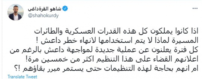 وقال في تغريدة عبر "تويتر" رصدها "المشهد العربي": "إذا كانوا يملكون كل هذه القدرات العسكرية والطائرات المسيرة لماذا لا يتم استخدامها لإنهاء خطر داعش".