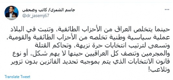 وقال في تغريدة عبر "تويتر" رصدها "المشهد العربي": "حينما يتخلص العراق من الأحزاب الطائفية، وتنبت في البلاد عملية سياسية وطنية تخلصه من الأحزاب الطائفية والقومية، وتسعى لترتيب انتخابات حرة نزيهة، وتحاكم القتلة والمجرمين وتنصف كل العراقيين حينها لا يهم شكل، أو نوع قانون الانتخابات الذي يتم بموجبه تحديد الفائزين بدون تزوير وتلاعب".