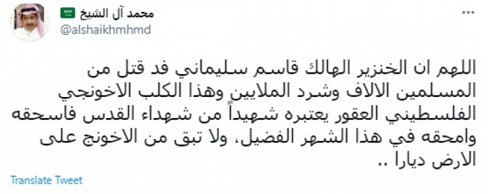 وقال في تغريدة عبر "تويتر" رصدها "المشهد العربي": "اللهم إن .... الهالك قاسم سليماني قد قتل من المسلمين الآلاف وشرد الملايين وهذا .... الاخونجي الفلسطيني العقور يعتبره شهيداً من شهداء القدس فاسحقه وامحقه في هذا الشهر الفضيل، ولا تبق من الإخونج على الأرض ديارًا".