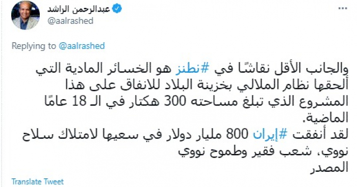 وكتب في تغريدة عبر "تويتر" رصدها "المشهد العربي": "والجانب الأقل نقاشًا في نطنز هو الخسائر المادية التي ألحقها نظام الملالي بخزينة البلاد للانفاق على هذا المشروع الذي تبلغ مساحته 300 هكتار في الـ 18 عامًا الماضية".