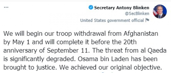 وقال في تغريدة على حسابه بموقع التدوين المصغر تويتر، اليوم إننا: "سنبدأ انسحاب قواتنا من أفغانستان بحلول الأول من مايو وسنكمله قبل الذكرى العشرين ليوم 11 سبتمبر"، مؤكدا أننا: "قدمنا أسامة بن لادن إلى العدالة، وحققنا هدفنا الأصلي".