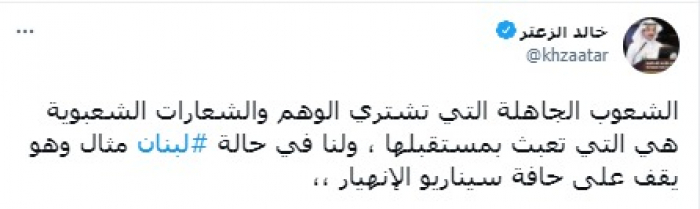 وأشار في تغريدة على حسابه بموقع التدوين المصغر تويتر، اليوم إلى أن: "الشعوب الجاهلة التي تشتري الوهم والشعارات الشعبوية هي التي تعبث بمستقبلها"، مضيفا أن: "لنا في حالة لبنان مثال وهو يقف على حافة سيناريو الانهيار".