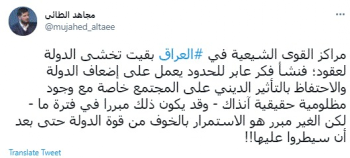 وكتب في تغريدة عبر "تويتر" رصدها "المشهد العربي": "مراكز القوى الشيعية في العراق بقيت تخشى الدولة لعقود؛ فنشأ فكر عابر للحدود يعمل على إضعاف الدولة والاحتفاظ بالتأثير الديني على المجتمع خاصة مع وجود مظلومية حقيقية آنذاك - وقد يكون ذلك مبررا في فترة ما - لكن الغير مبرر هو الاستمرار بالخوف من قوة الدولة حتى بعد أن سيطروا عليها".