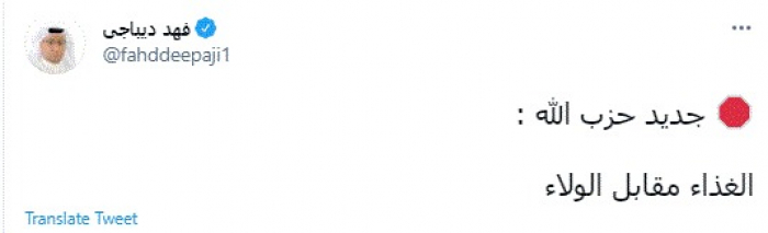 وقال في تغريدة عبر "تويتر" رصدها "المشهد العربي": "جديد حزب الله: الغذاء مقابل الولاء".