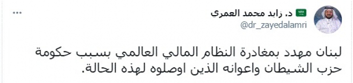 وكتب في تغريدة عبر "تويتر" رصدها "المشهد العربي": "لبنان مهدد بمغادرة النظام المالي العالمي بسبب حكومة حزب الشيطان واعوانه الذين اوصلوه لهذه الحالة".