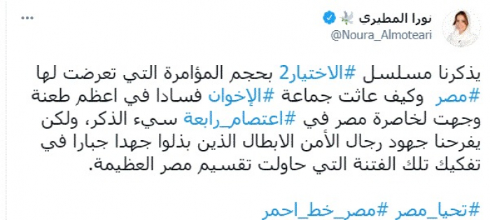 قالت الكاتبة والباحثة نورا المطيري، اليوم، إن مسلسل الاختيار 2 يكشف حجم المؤامرة الإخوانية التي تعرضت لها مصر.