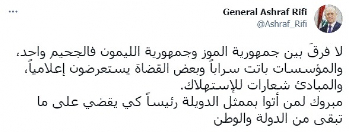 وقال في تغريدة عبر "تويتر" رصدها "المشهد العربي": "لا فرقَ بين جمهورية الموز وجمهورية الليمون فالجحيم واحد، والمؤسسات باتت سراباً وبعض القضاة يستعرضون إعلامياً، والمبادئ شعارات للإستهلاك. مبروك لمن أتوا بممثل الدويلة رئيساً كي يقضي على ما تبقى من الدولة والوطن".