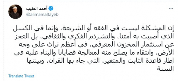 وكتب في تغريدة عبر "تويتر" رصدها "المشهد العربي": "إن المشكلة ليست في الفقه أو الشريعة، وإنما في الكسل الذي أُصيبت به أمتنا، والتشرذم الفكري والثقافي، بل العجز عن استثمار المخزون المعرفي، في أعظم تراث على وجه الأرض، وانتقاء ما يصلح منه لمعالجة قضايانا والبناء عليه في إطار قاعدة الثابت والمتغير، التي جاء بها القرآن، وبينتها السنة".