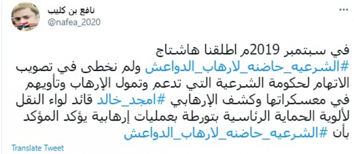 وكتب في تغريدة عبر "تويتر" رصدها "المشهد العربي": "في سبتمبر 2019م اطلقنا هاشتاج الشرعية حاضنة لإرهاب الدواعش ولم نخطى في تصويب الاتهام لحكومة الشرعية التي تدعم وتمول الإرهاب وتأويهم في معسكراتها".