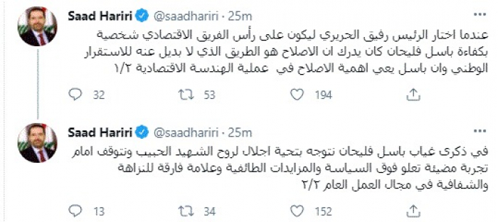 وقال في تغريدات عبر "تويتر" رصدها "المشهد العربي": "عندما اختار الرئيس رفيق الحريري ليكون على رأس الفريق الاقتصادي شخصية بكفاءة باسل فليحان كان يدرك أن الإصلاح هو الطريق الذي لا بديل عنه للاستقرار الوطني وان باسل يعي أهمية الإصلاح في عملية الهندسة الاقتصادية".