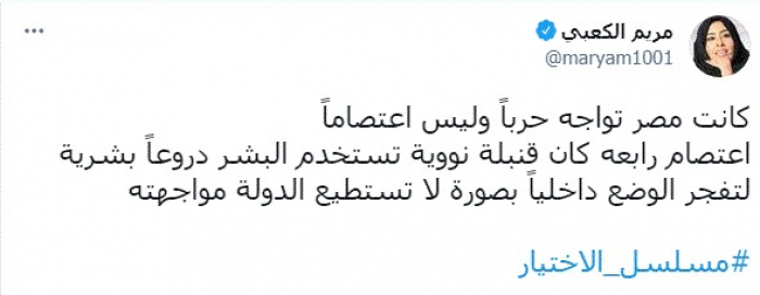 قالت الإعلامية الإماراتية مريم الكعبي، اليوم، إن اعتصام رابعة كان قنبلة نووية لاستخدام البشر لتفجير الوضع داخليًا، مؤكدةً أن مصر كانت تواجه حربًا وليس اعتصامًا.