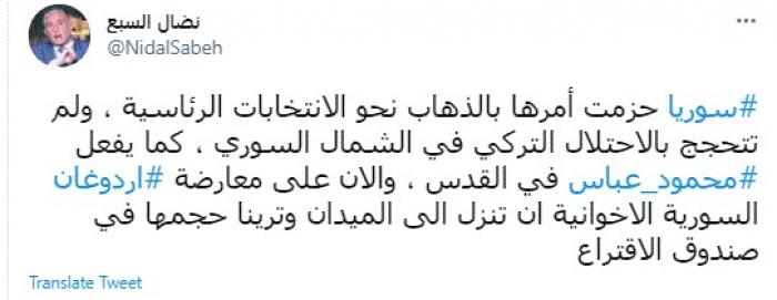 وقال في تغريدة عبر "تويتر" رصدها "المشهد العربي": "سوريا حزمت أمرها بالذهاب نحو الانتخابات الرئاسية ، ولم تتحجج بالاحتلال التركي في الشمال السوري، كما يفعل محمود عباس في القدس".