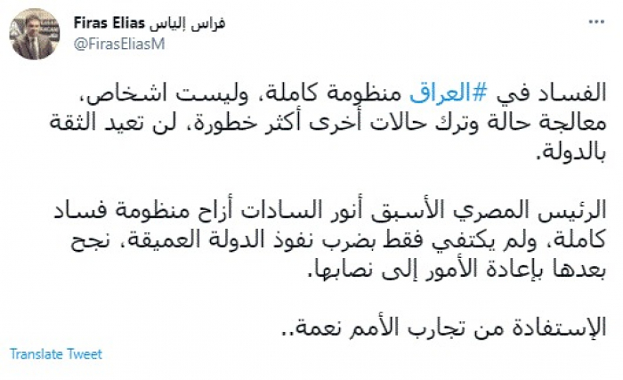 وقال في تغريدة عبر "تويتر" رصدها "المشهد العربي": "الفساد في العراق منظومة كاملة، وليست اشخاص، معالجة حالة وترك حالات أخرى أكثر خطورة، لن تعيد الثقة بالدولة".