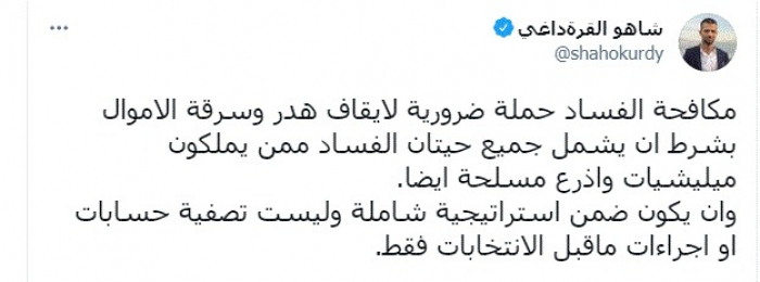 كشف الكاتب الصحفي العراقي شاهو القرةداغي، اليوم، أهمية حملات مكافحة الفساد في العراق، مطالبًا بأن تشمل حيتان الفساد التي تملك مليشيات وأذرع مسلحة.