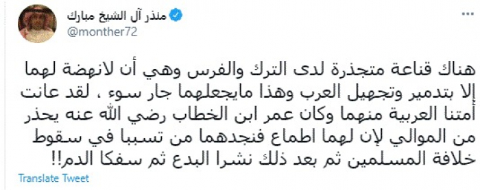 وقال في تغريدة عبر "تويتر" رصدها "المشهد العربي": "هناك قناعة متجذرة لدى الترك والفرس وهي أن لانهضة لهما إلا بتدمير وتجهيل العرب وهذا ما يجعلهما جار سوء".