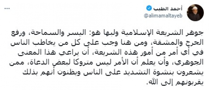 وشدد في تغريدة على حسابه بموقع التدوين المصغر تويتر، اليوم على أن: "جوهر الشريعة الإسلامية ولبها هو: اليسر والسماحة، ورفع الحرج والمشقة".