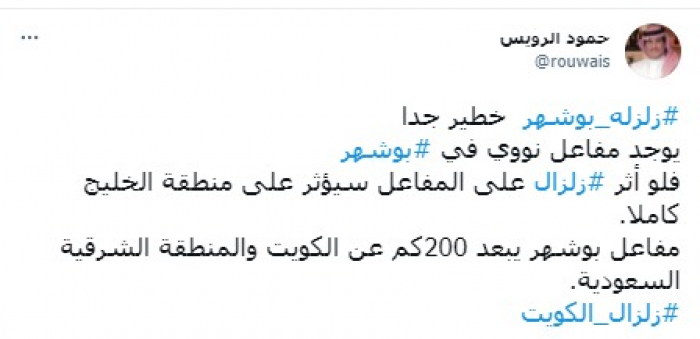 وأكد أن: "مفاعل بوشهر يبعد 200 كم عن الكويت والمنطقة الشرقية السعودية"، مختتما بهاشتاج: "زلزال الكويت".