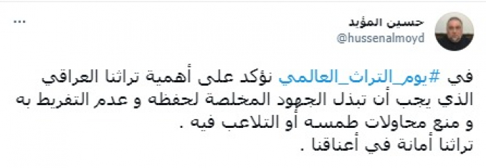 ولفت في تغريدة على حسابه بموقع التدوين المصغر تويتر، اليوم إلى أنه: "في يوم التراث العالمي نؤكد على أهمية تراثنا العراقي".