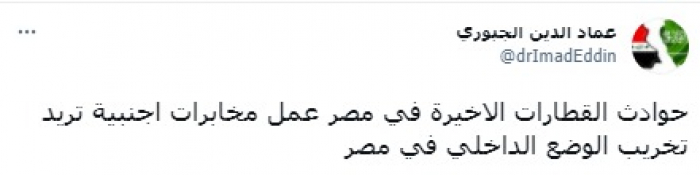 وقال في تغريدة على حسابه بموقع التدوين المصغر تويتر، اليوم إن: "حوادث القطارات الأخيرة في مصر عمل مخابرات أجنبية تريد تخريب الوضع الداخلي في مصر".