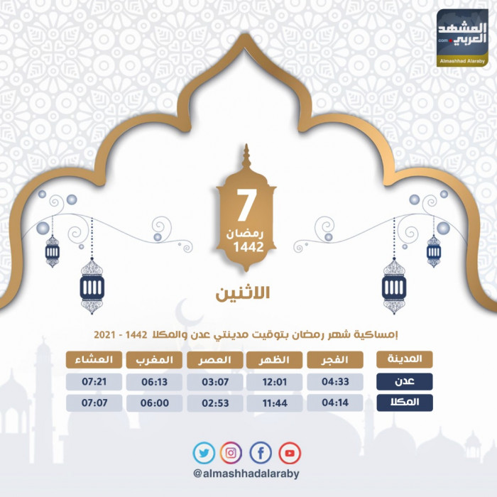 حلت سابع ليالي شهر رمضان المبارك، مع اقتراب موعد أذان الفجر، حيث يؤذن في تمام الساعة 4.33 بالعاصمة عدن، و4.14 بتوقيت مدينة المكلا في حضرموت.