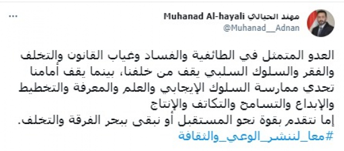 وأكد في تغريدة على حسابه بموقع التدوين المصغر تويتر، اليوم أن: "العدو المتمثل في الطائفية والفساد وغياب القانون والتخلف والفقر والسلوك السلبي يقف من خلفنا".