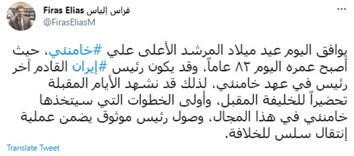 وقال في تغريدة عبر "تويتر" رصدها "المشهد العربي": "يوافق اليوم عيد ميلاد المرشد الأعلى علي خامنئي، حيث أصبح عمره اليوم ٨٢ عاماً، وقد يكون رئيس إيران القادم آخر رئيس في عهد خامنئي".