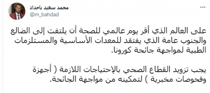 وقال في تغريدة عبر "تويتر" رصدها "المشهد العربي": "على العالم الذي أقر يوم عالمي للصحة أن يلتفت إلى الضالع والجنوب عامة الذي يفتقد للمعدات الأساسية والمستلزمات الطبية لمواجهة جائحة كورونا".