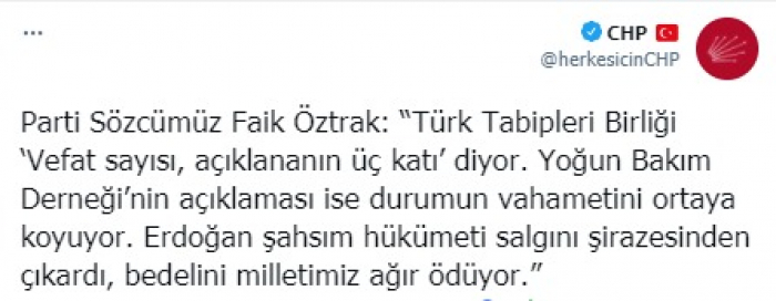 ونشر الحزب في تغريدة على حسابه بموقع التدوين المصغر تويتر، اليوم جانبا من تصرحيات أوزتراك قال فيها: "الجمعية الطبية التركية تقول" عدد الوفيات ثلاثة أضعاف العدد المعلن".