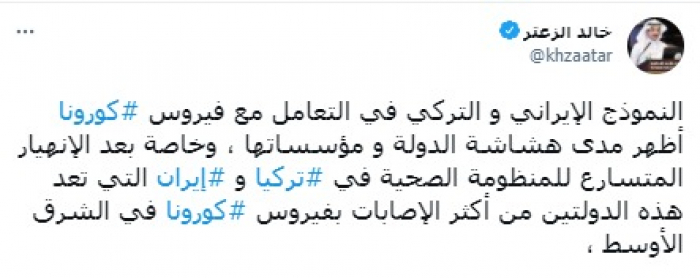 وقال في تغريدة على حسابه بموقع التدوين المصغر تويتر، اليوم إن: "النموذج الإيراني والتركي في التعامل مع فيروس كورونا أظهر مدى هشاشة الدولة ومؤسساتها".