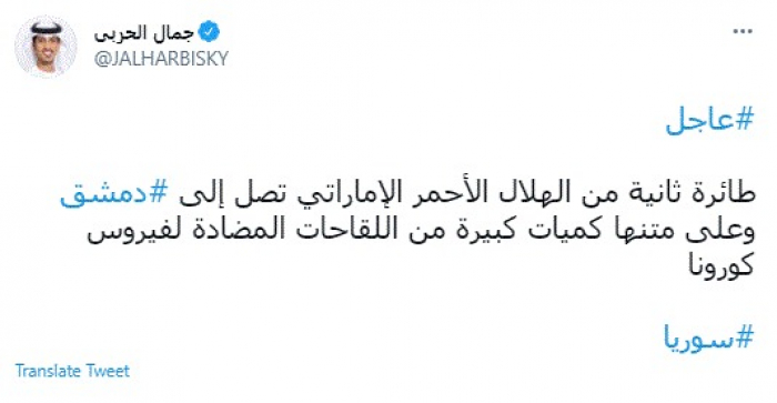 وكتب في تغريدة عبر "تويتر" رصدها "المشهد العربي": "طائرة ثانية من الهلال الأحمر الإماراتي تصل إلى دمشق وعلى متنها كميات كبيرة من اللقاحات المضادة لفيروس كورونا".