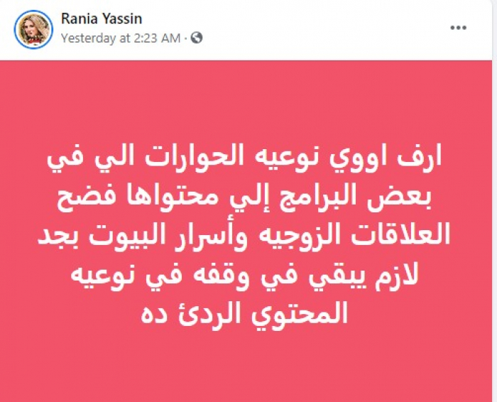وكتبت رانيا منشورًا، عبر صفحتها الشخصية بموقع "فيسبوك"، علقت :"أرف أوي نوعية الحوارات اللي في بعض البرامج اللي محتواها فضح العلاقات الزوجية وأسرار البيوت، بجد لازم يبقى في وقفة في نوعية المحتوى الرديء دا".