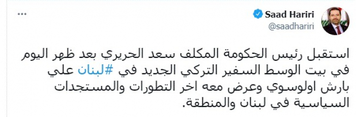 وقال في تغريدة عبر "تويتر" رصدها "المشهد العربي": "استقبل رئيس الحكومة المكلف سعد الحريري بعد ظهر اليوم في بيت الوسط السفير التركي الجديد في لبنان علي بارش اولوسوي وعرض معه اخر التطورات والمستجدات السياسية في لبنان والمنطقة".