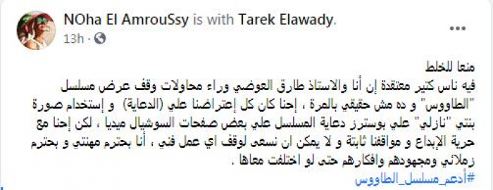 وكتبت العمروسي، عبر حسابها بموقع "فيسبوك": "منعا للخلط.. فيه ناس كتير معتقدة إن أنا والأستاذ طارق العوضي وراء محاولات وقف عرض مسلسل (الطاووس)، وده مش حقيقي بالمرة".