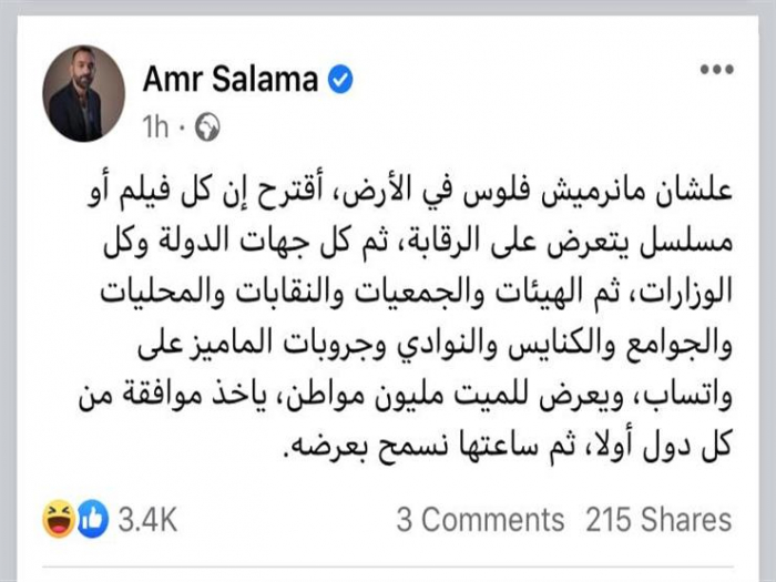 وكتب "سلامة" عبر صفحته الرسمية بموقع "فيس بوك" :" علشان مانرميش فلوس في الأرض، أقترح إن كل فيلم أو مسلسل يتعرض على الرقابة، ثم كل جهات الدولة وكل الوزارات، ثم الهيئات والجمعيات والنقابات والمحليات والجوامع والكنايس والنوادي وجروبات الماميز على واتساب، ويعرض للميت مليون مواطن، ياخذ موافقة من كل دول أولا، ثم ساعتها نسمح بعرضه".