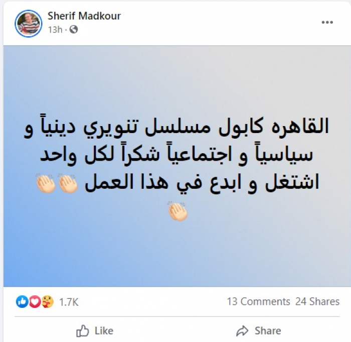 وكتب "مدكور"، عبر حسابه بموقع "فيسبوك": "القاهرة كابول مسلسل تنويري دينيا وسياسيا واجتماعيا.. شكرا لكل واحد اشتغل وأبدع في هذا العمل".