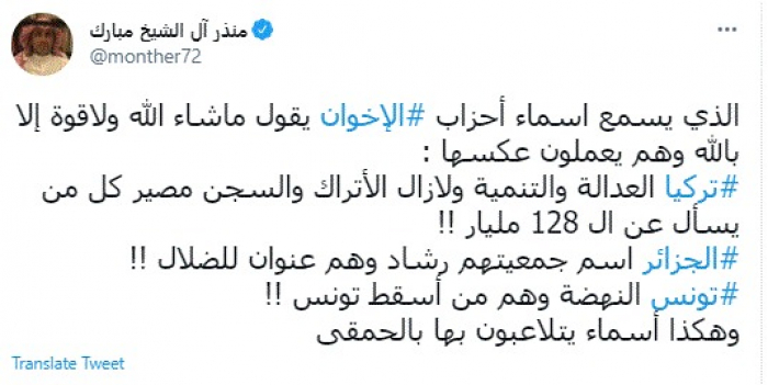 هاجم المدون السعودي البارز منذر آل الشيخ، اليوم، الأذرع السياسية لتنظيم الإخوان في تونس والجزائر.