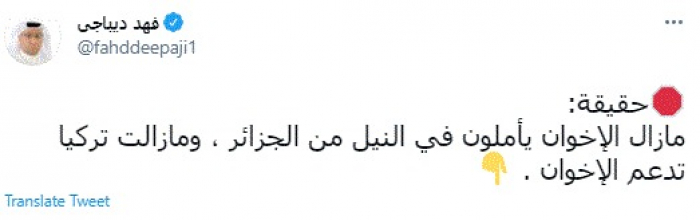 وكتب في تغريدة عبر "تويتر" رصدها "المشهد العربي": "حقيقة: ما زال الإخوان يأملون في النيل من الجزائر، وما زالت تركيا تدعم الإخوان".