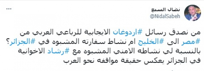 وتساءل في تغريدة على حسابه بموقع التدوين المصغر تويتر، اليوم: "من نصدق رسائل أردوغان الإيجابية للرباعي العربي من مصر إلى الخليج، أم نشاط سفارته المشبوه في الجزائر؟".