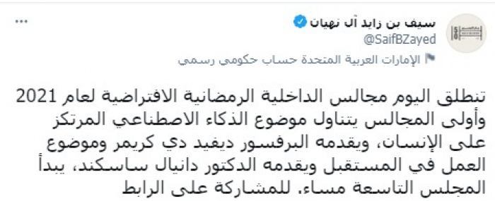 أعلن الفريق الشيخ سيف بن زايد بن سلطان آل نهيان، نائب رئيس مجلس وزراء دولة الإمارات العربية، وزير الداخلية، انطلاق مجالس رمضانية افتراضية حول ملفات منها الذكاء الاصطناعي.
