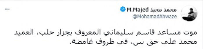 وأكد في تغريدة على حسابه بموقع التدوين المصغر تويتر، اليوم: "موت مساعد قاسم سليماني المعروف بجزار حلب، العميد محمد علي حق بين، في ظروف غامضة".