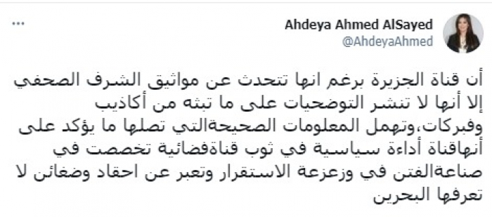 وأشارت في تغريدة على حسابها بموقع التدوين المصغر تويتر، اليوم إلى: "أن قناة الجزيرة برغم أنها تتحدث عن مواثيق الشرف الصحفي إلا أنها لا تنشر التوضحيات على ما تبثه من أكاذيب وفبركات، وتهمل المعلومات الصحيحة التي تصلها".