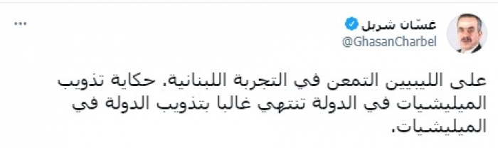 حذر الكاتب الصحفي غسان شربل الليبيين من استنساخ تجربة لبنان باحتضان المليشيات داخل أركان الدولة.