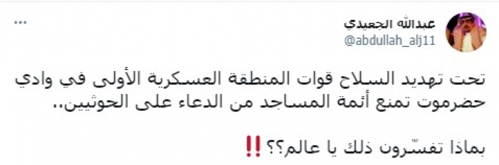 وأشار في تغريدة على حسابه بموقع التدوين المصغر تويتر، اليوم إلى أنه: "تحت تهديد السلاح قوات المنطقة العسكرية الأولى في وادي حضرموت تمنع أئمة المساجد من الدعاء على الحوثيين"، متسائلا: "بماذا تفسّرون ذلك يا عالم؟؟".