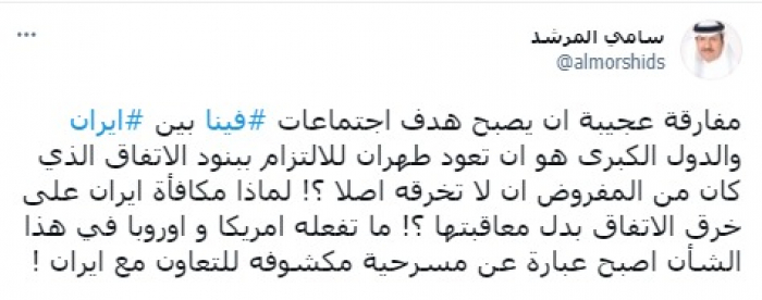 واعتبر في تغريدة على حسابه بموقع التدوين المصغر تويتر، اليوم أنها: "مفارقة عجيبة أن يصبح هدف اجتماعات فيينا بين إيران والدول الكبرى هو أن تعود طهران للالتزام ببنود الاتفاق الذي كان من المفروض أن لا تخرقه أصلا؟!".