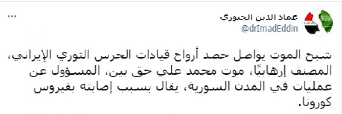 أكد المحلل السياسي عمادالدين الجبوري، أن الموت بفيروس كورونا يواصل حصد قيادات الحرس الثوري الإيراني الإرهابي.