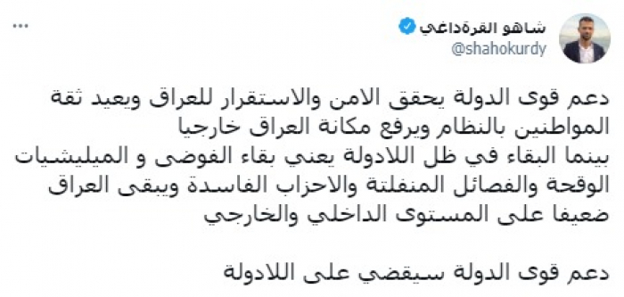 رأى الكاتب الصحفي شاهو قرة داغي، أن تحقيق الأمن والاستقرار في العراق يتطلب دعم قوى الدولة، ويعزز مكانته دوليا.