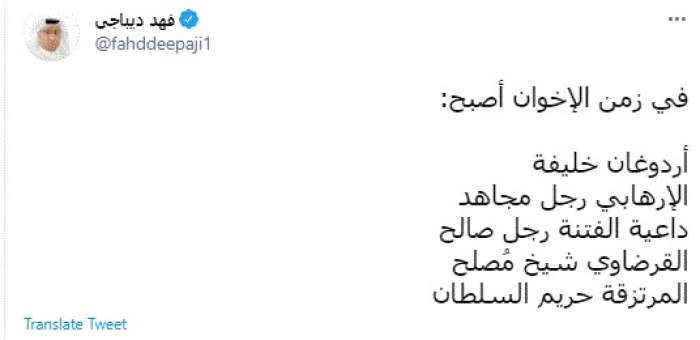 وقال في تغريدة عبر "تويتر" رصدها "المشهد العربي": "في زمن الإخوان أصبح: أردوغان خليفة.. الإرهابي رجل مجاهد.. داعية الفتنة رجل صالح.. القرضاوي شيخ مُصلح.. المرتزقة حريم السلطان".