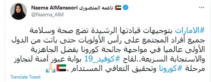 وكتبت في تغريدة عبر "تويتر" رصدها "المشهد العربي": "الإمارات بتوجيهات قيادتها الرشيدة تضع صحة وسلامة جميع أفراد المجتمع على رأس الأولويات حتى باتت من الدول الأولى عالميا في مواجهة جائحة كورونا بفضل الجاهزية والاستجابة السريعة..لقاح كوفيد 19 بوابة عبور آمنة لتجاوز مرحلة كورونا وتحقيق التعافي المستدام".