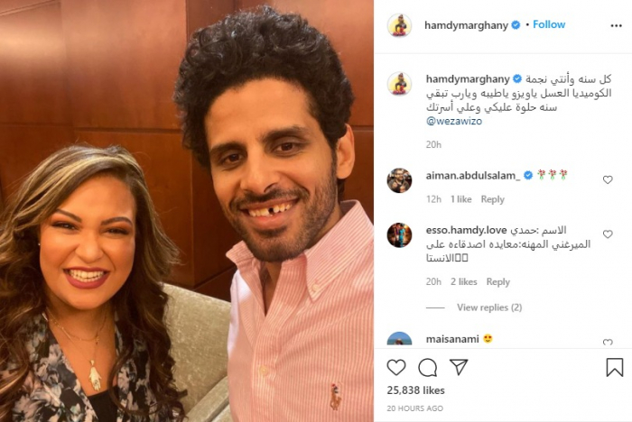 ونشر الميرغني صورة تجمعهما، عبر حسابه الرسمي بموقع "إنستجرام"، علق :"كل سنة وأنتي نجمة الكوميديا العسل يا ويزو يا طيبة ويارب تبقى سنة حلوة عليكي وعلى أسرتك".